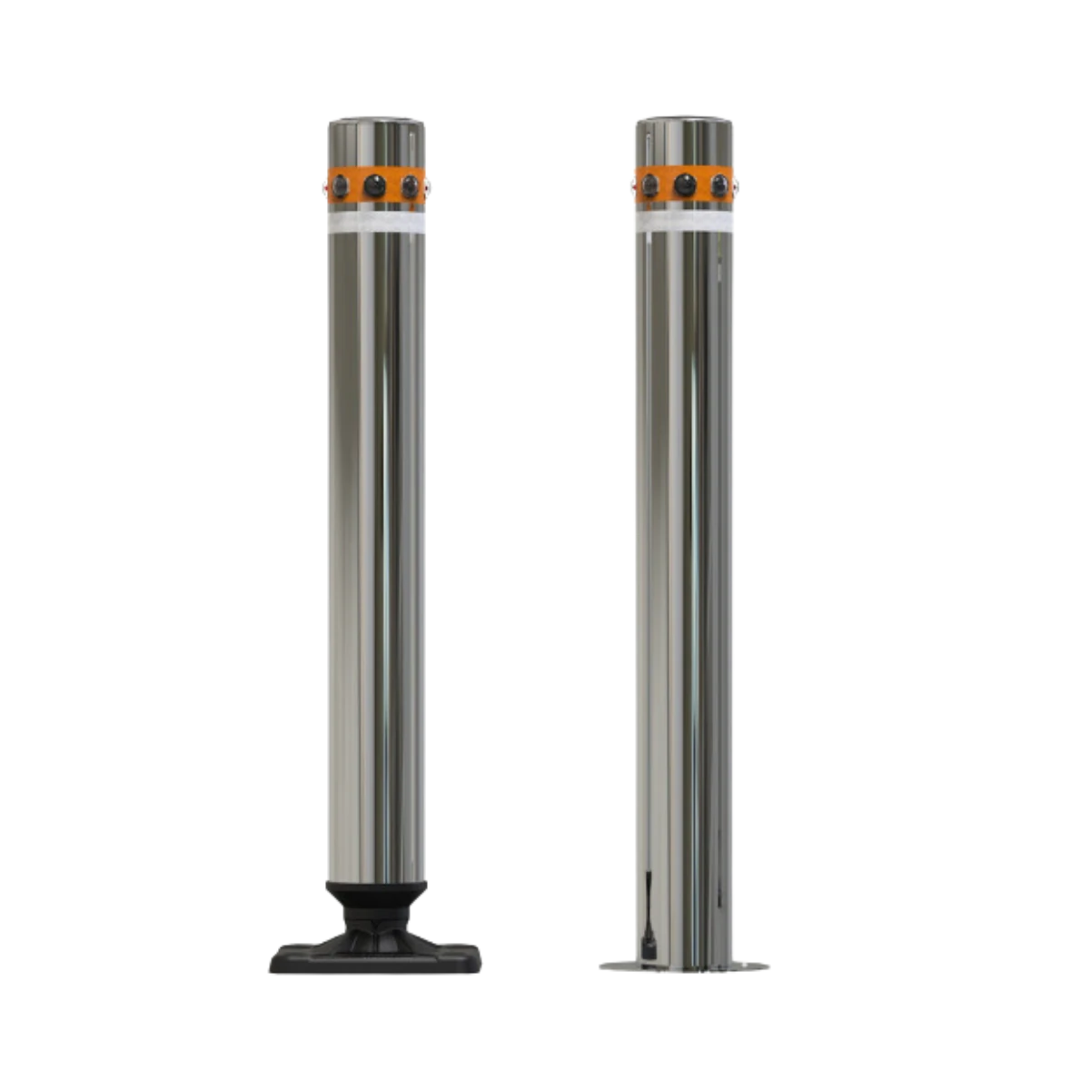 La versión fija presenta una base de acero inoxidable que se taquetea para asegurar su inmovilidad, proporcionando una barrera sólida y estable. Por otro lado, la versión abatible está equipada con una base de ABS y un sistema interno que le permite inclinarse cuando es golpeado, absorbiendo el impacto y recuperando rápidamente su posición vertical, lo que minimiza los daños tanto al bolardo como a los vehículos involucrados.